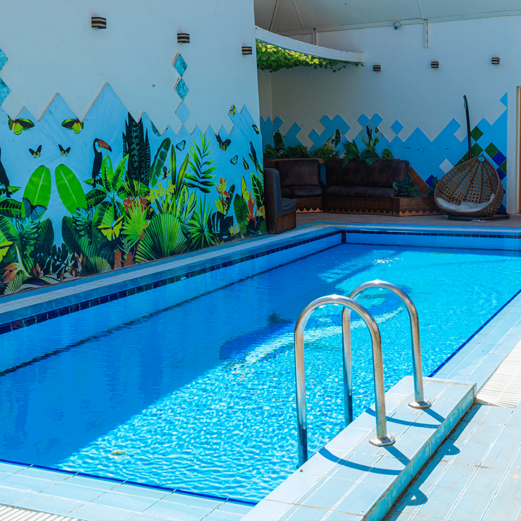 مُطِل على حمام السباحة، يقدم مأكولات و مشروبات مختلفة ترضي جميع الأذواق.